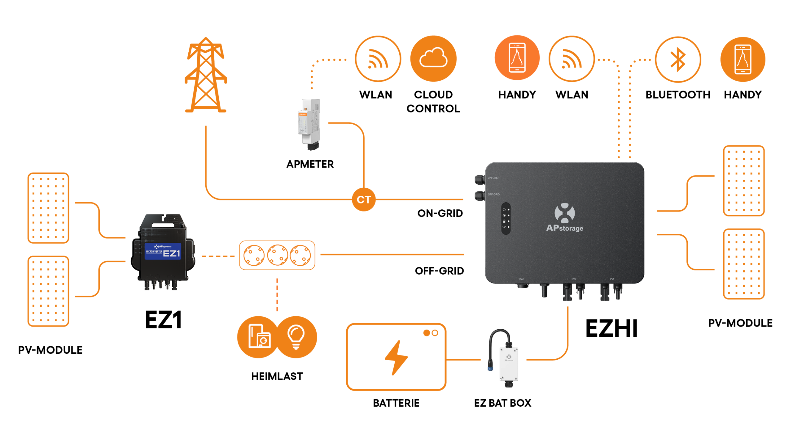 Das EZHI-System kann nahtlos in die bestehende steckerfertige PV-Anlage integriert werden, wodurch das Solarsystem in ein Photovoltaik-Energiespeichersystem aufgewertet wird.